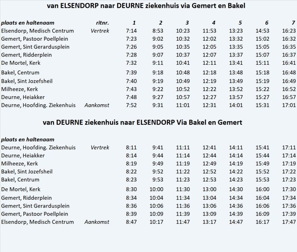 Onze buurtbus, verzorgt van maandag t/m vrijdag van 7.14 uur tot 17.49 uur (met uitzondering van door de Rijksoverheid vastgestelde feestdagen, carnavals-maandag en dinsdag en de laatste rit (16.23 uur - 17.49 uur) op 24 en 31 december, buslijn 268 van Elsendorp naar Deurne (Elkerliek ziekenhuis). 1x per 1.5 uur.